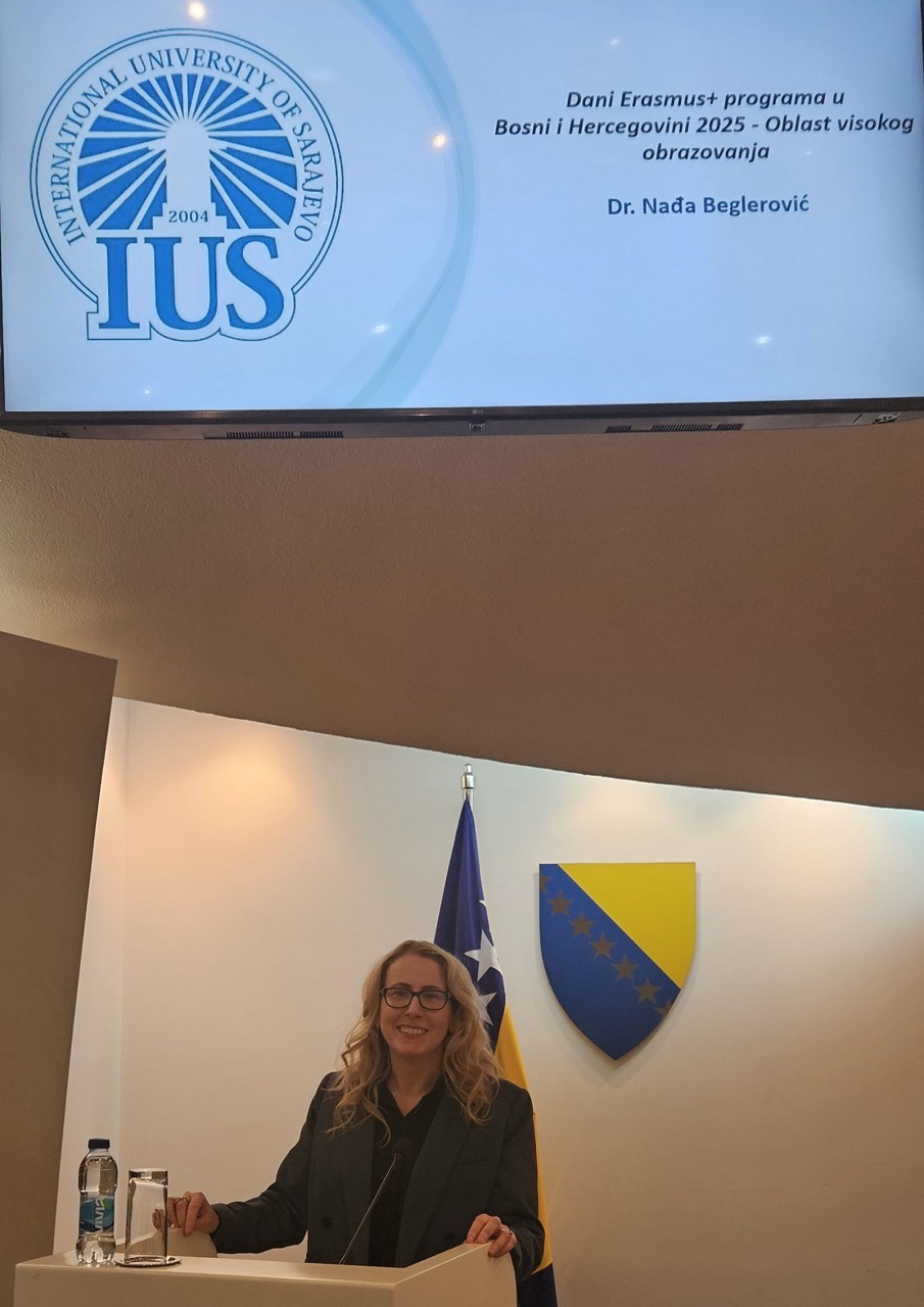 Među pozvanim govornicima bila je i dr. Nađa Beglerović, rukovodilac Ureda za sponzorisane projekte na Internacionalnom univerzitetu u Sarajevu (IUS). Govorila je o aktivnostima IUS-a u okviru Erasmus+ programa, a njena prezentacija bila je izuzetno dobro prihvaćena, što ističe aktivno učešće našeg univerziteta i uspješnu realizaciju Erasmus+ inicijativa. Dr. Beglerović je predstavila primjere najboljih praksi na IUS-u, uključujući različite projekte, međunarodna partnerstva i mobilnosti koje jačaju ulogu IUS-a u unapređenju međunarodne saradnje u visokom obrazovanju.